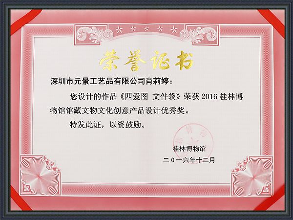 深圳市元景工藝品限公司肖莉婷設(shè)計(jì)師設(shè)計(jì)作品《四愛圖 文件袋》榮獲2016桂林博物館館藏文物文化創(chuàng)意產(chǎn)品設(shè)計(jì)二等獎(jiǎng)。